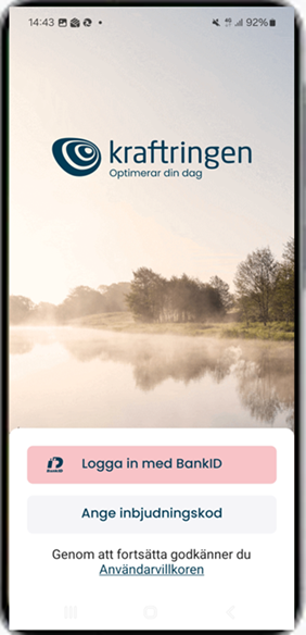 Innan du loggar in skall du ta del av appens användarvillkor. Dessa beskriver bland annat villkoren mellan Kraftringen som leverantör av appen och dig som användare av appen. Här finns också information om hur vi hanterat dina personuppgifter i enlighet med GDPR. Användarvillkoren kan du alltid hitta vid senare tillfälle dels via appen samt dels på Kraftringens hemsida Kraftringen.se.