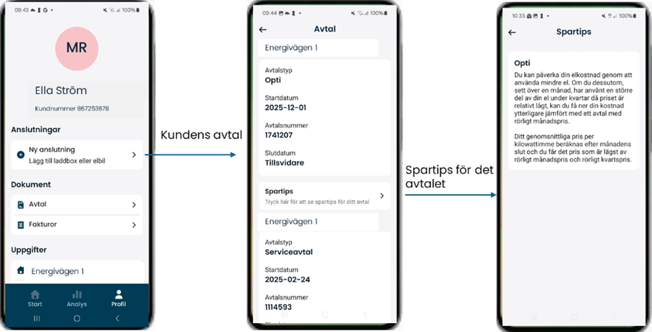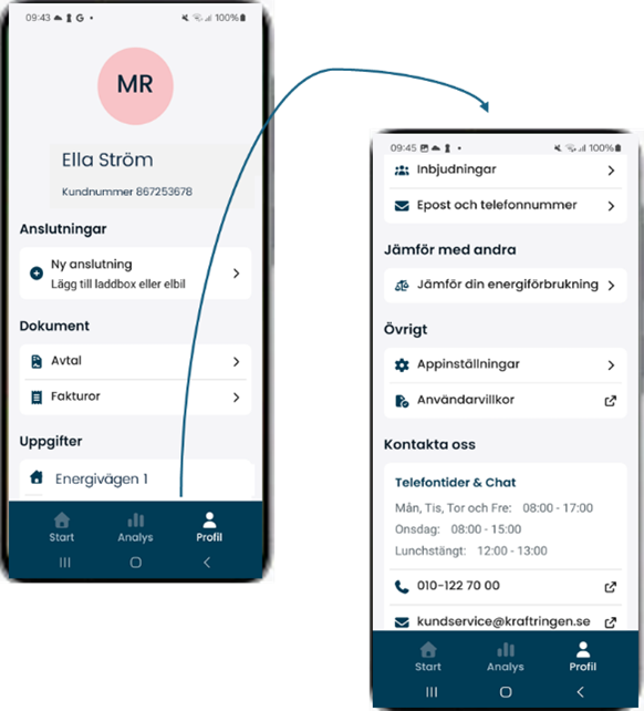 I Profil hittar du information om ditt kundnummer hos Kraftringen, dina olika avtal med Kraftringen, dina fakturor från Kraftringen, uppgifter om din bostad, energijämförelse med liknade bostäder, spartips, inställningar du kan göra i appen, användarvillkoren för appen samt hur och när du kan kontakta oss.