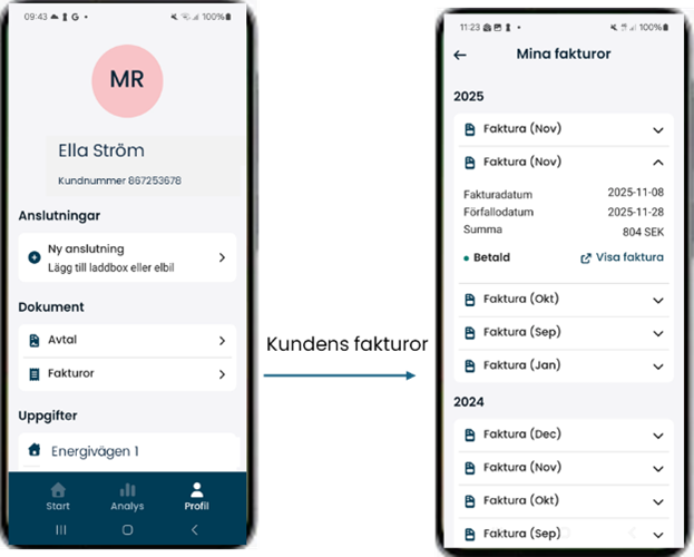 Under dokument hittar du även dina fakturor. För varje faktura kan du se fakturadatum, förfallodatum, fakturabelopp samt status gällande betalningen av fakturan. Du kan också öppna fakturan. För vissa telefoner går det av informationssäkerhetsskäl inte möjlighet att öppna fakturan och då laddas fakturan ner till din telefon som ett pdf dokument som du därefter kan öppna.