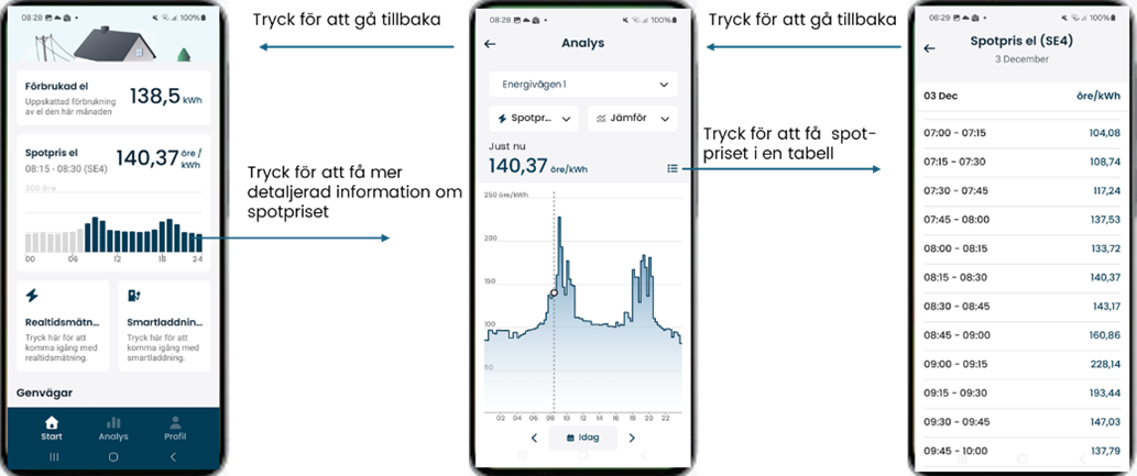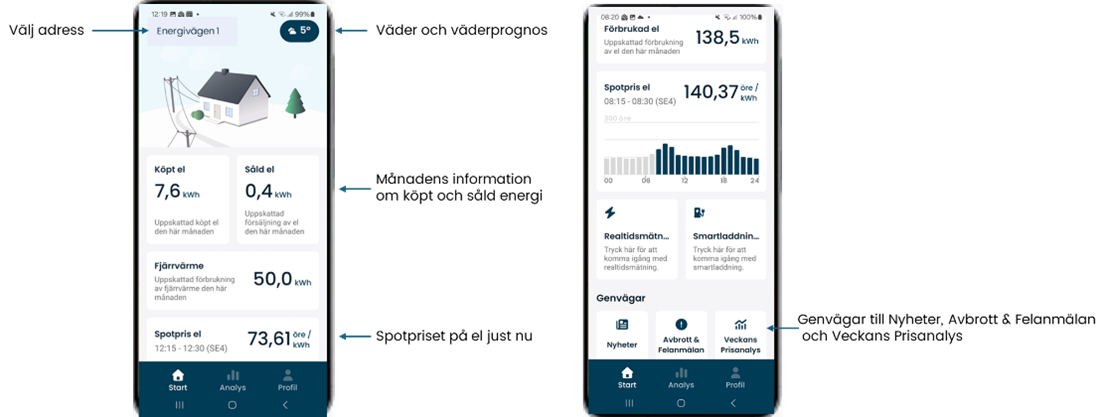 På startvyn presenteras en sammanfattning av köpt/såld el, fjärrvärmeförbrukning och gasförbrukning under innevarande månad. Du kan även se spotpriset på el just nu.