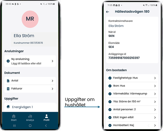 Under rubriken Uppgifter kan du gå in på din adress och beskriva hushållet ur ett energiperspektiv. Genom att få ta del av denna information kan vi bland annat lättare avgöra vad vi kan ge dig för tips och råd för att påverka din energisituation.