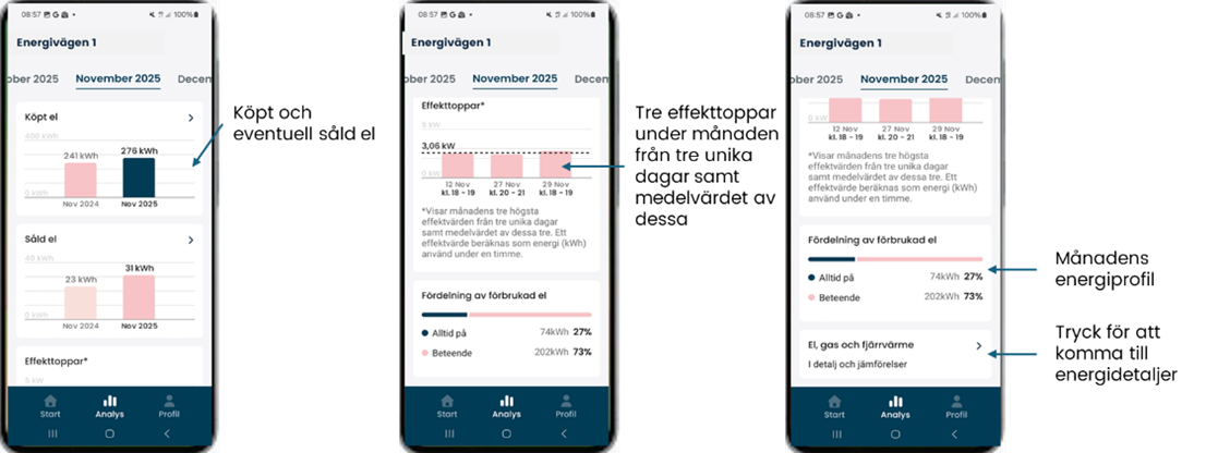 Det kommer att bli allt viktigare att inte bara använda mindre energi utan också att få kontroll över effektuttaget. En funktion i appen är därför att för varje månad visa vilka tre högsta effekttoppar du har haft och när de inträffade.