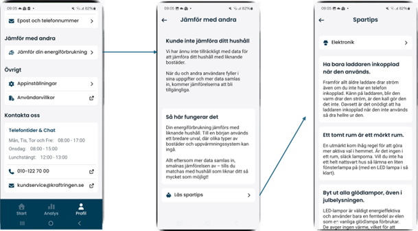 Genom appen kan du få se en jämförelse av din energianvändning med liknande hushåll. För att denna jämförelse skall kunna göras måste du ha fyllt i den beskrivning som kan göras av hushållet. Utöver beskrivningen av hushållet behöver appen få in energirelaterad mätdata under en viss tid, vilket sker med automatik baserat på de olika avtal du har med Kraftringen. Du hittar här även olika nyttiga spartips för din energianvändning.