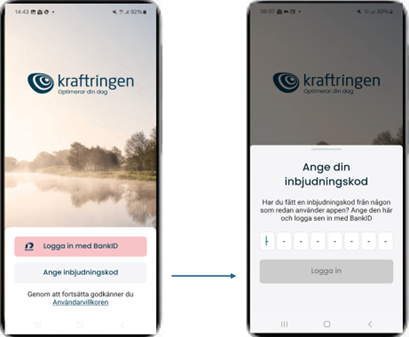Om man inte är inloggad i appen så kan man acceptera en inbjudan genom att vid inloggningen i appen välja alternativet ”Ange inbjudningskod” och då ange den kod som man fått.
