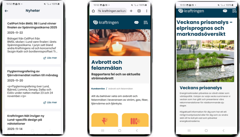 Via appen får du varje vecka senaste nytt om energimarknaden och en prisanalys för den kommande veckan. Du får en överblick av vilka avtal du har med Kraftringen och du kan se (i vissa fall ladda ner) dina fakturor och betalningsstatus.