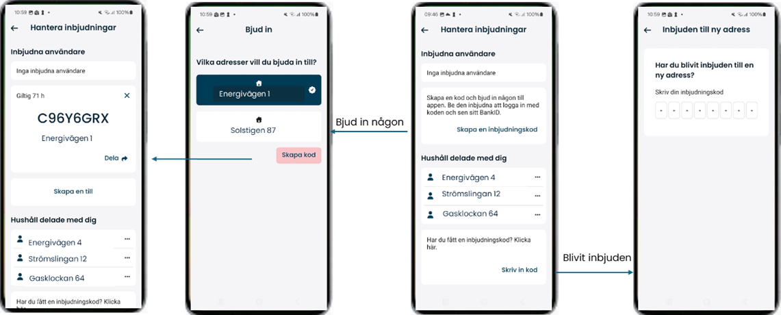 Under rubriken Uppgifter hittar du även funktionen Inbjudningar. Här kan du skapa en inbjudningskod som du kan dela med någon som därefter kan välja din adress i appen och då se all information och data som du kan se i appen. På samma sätt kan du här lägga in koden från en annan användare av appen och därefter se den användarens information och data i appen genom att välja deras adress i startvyn.
