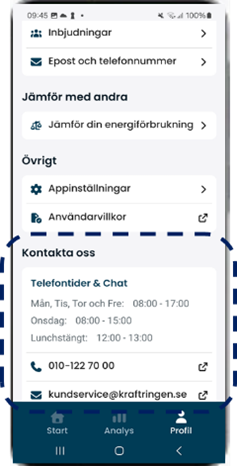Behöver du kontakta oss? Längst ner i profilvyn hittar du information om hur och när vi är tillgängliga.